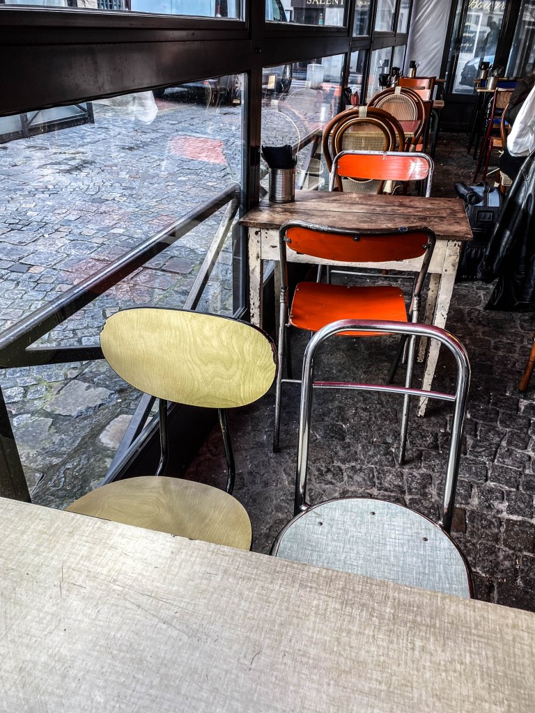 Sauf que là je ne sais pas, je ne sais plus s’il faut crier au génie ou au foutage de gueule. Il est vrai que la frontière entre les deux est parfois ténue. Place Sainte-Catherine à Paris, le petit bar où je me pose pour prendre un café et meublé de sièges et de tables hétéroclites. Le mot est faible. Du mobilier sorti tout droit de chez Emmaüs, de la déchèterie du coin et du dépôt d’encombrants du quartier. En vrac, des chaises en formica, des tables du même acabit, des bureaux d’écoliers époque Sadi Carnot, des fauteuils clubs au cuir avachi. Alors oui, si tout avait été aligné, restauré, nettoyé, savamment agencé, alors oui, j’aurais surement été extasié. Mais là, l’ensemble proposé à mon regard perplexe est garanti « dans son jus », avec même encore, çà et là, des stigmates de sauce renversée ou des restes d’encre bleu séchée pour l’éternité autour des orifices ayant accueilli au siècle dernier des encriers de porcelaine. J’allais oublier les couverts, car ici ou mange, ils sont de la même origine, et ont trouvé refuge dans des anciennes boites de conserves juste à peine un peu rouillées, comme si c’était fait exprès.