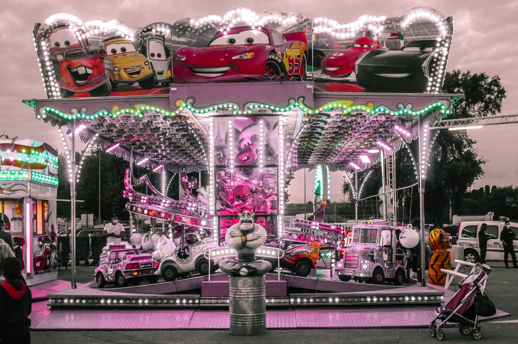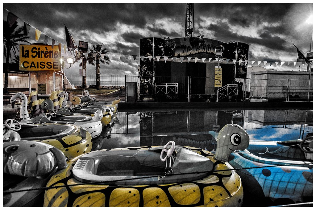 Quand je me retrouve dans une fête foraine, je pense toujours au film d’Hitchcock « L’Inconnu du Nord-Express » et cette femme aux airs un peu cruche (les lunettes vintage y sont pour beaucoup) qui se fait trucider sur l’île aux amoureux. Il y a aussi cette scène finale sur le manège aux chevaux de bois dont on a perdu le contrôle. Mais pourquoi donc les figures animales qui sont souvent l’apanage des attractions me font plus peur que rire ? Alors, pour conjurer ces peurs primales, il m’arrive de perdre mes pas entre les stands et les manèges des foires quand celles-ci sont encore fermées, vides, à l’abandon, endormies, fantomatiques. Mais là, mauvaise pioche, ces gargouilles modernes sont encore plus effrayantes. Et savoir que ces monstres sont en plastique ne me rassure pas du tout. Le diable se cache dans les détails.