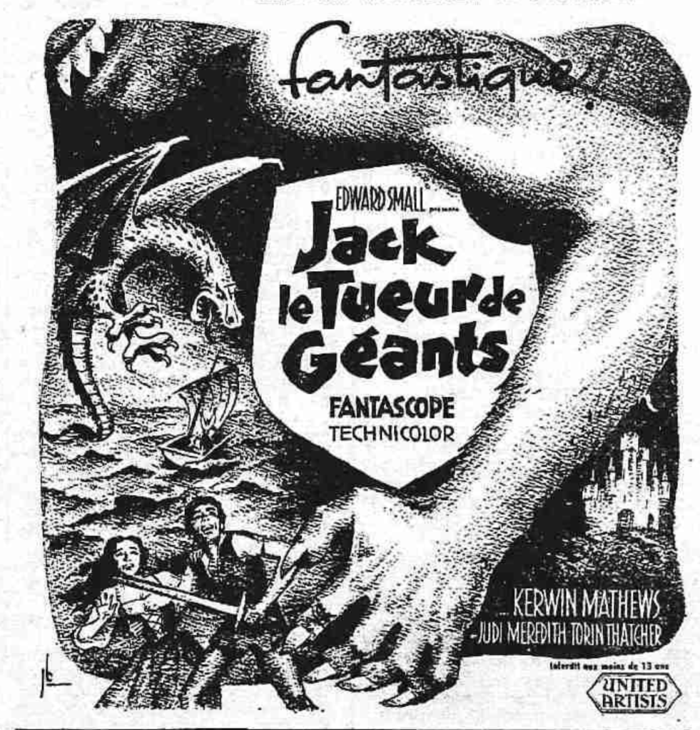 Dans les années soixante, soixante-dix les journaux publiaient des vignettes en noir et blanc annonçant les films à l’affiche. Des œuvres éphémères qui en disent autant sur l’époque que sur le film en question. Prenez par exemple Jack le tueur de géants de 1962. On est prévenu dès la première ligne, c’est « fantastique ! », dans le sens science-fiction et mondes oniriques noirs. Un sous genre à la mode qui explore l’histoire ancienne, médiévale à souhait. L’image a tout pour convaincre l’ado de l’époque, un lézard volant aux serres implacables, qui traque un frêle esquif, un château qui émerge de la nuit, et l’ado lui-même qui se reconnait en train de protéger sa bien-aimée, armée d’un glaive vengeur un peu surdimensionné. Il va devoir lutter contre une main qui n’a rien d’invisible, et dont le propriétaire possède une belle dentition quelque peu pointue. Le film est tiré d’un conte populaire anglais fantsatico onirique. Plus récemment et toujours dans la ligne du sous genre fantasy une autre adaptation a été proposée aux enfants des ados sus-mentionnés, en 2013 c’est devenu Jack le chasseur de géants. C’est après seulement qu’il a rencontré le Haricot magique. Les hauts et les bas de la vie d’aventurier.