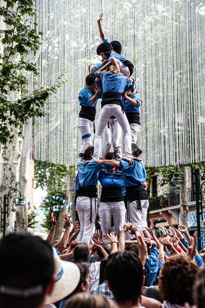 Parmi les expressions artistico sportives de la Catalogne, les castell (pyramide humaine, littéralement : château) sont certainement les plus spectaculaires. Si le profane ne voit qu’un exploit sportif, celui qui sait, y voit bien plus qu’une démonstration physique digne d’épater la galerie. Le castell est, ni plus ni moins, le symbole d’une société idéale. Une architecture humaine où chaque pierre, chaque personne, trouve sa place dans l’édifice. Tu es fort et ta masse musculaire est imposante, prends ta place à la base du château. Tu es souple avec des épaules solides, tu seras en position intermédiaire et supportera le reste de la colonne. Tu as le vertige, angoissé par le risque de tomber mais avec l’oreille musicale ? Entre dans le groupe de musicos qui va rythmer le montage du castell. Tu es jeune, sans peur et plein d’espoir ? Tu seras celui ou celle qui tout en haut du château lèvera le bras pour dire que la mission du groupe est accomplie, l’élévation de tous dans une parfaite verticalité et dans un équilibre sans faille est réalisée. Tous ensemble dans un but commun : s’élever, c’est ça aussi le castell, prouver que c’est possible. Alors si c’est possible à l’échelle d’une centaine d’hommes et de femmes de tous les horizons pourquoi cela ne serait-il pas le cas pour une société, une nation ? Oui, je sais je suis un peu rêveur.