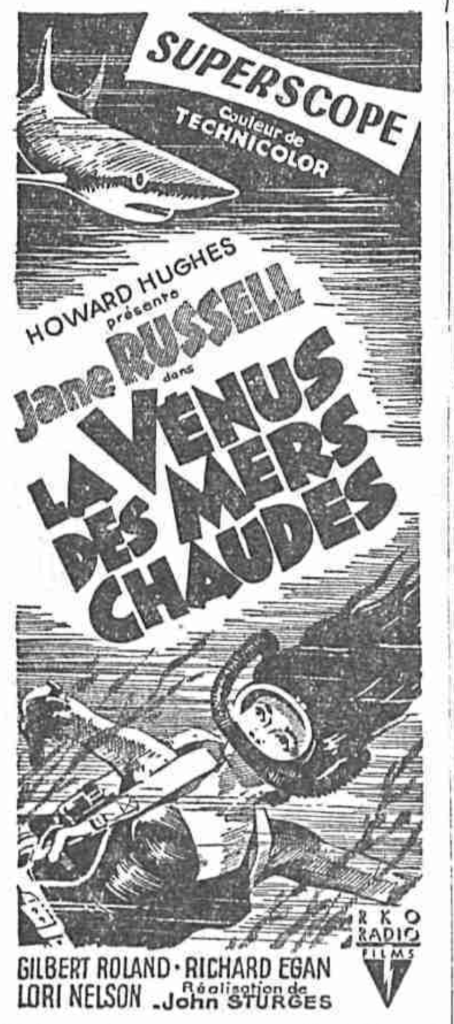 Dans les années cinquante les journaux publiaient des vignettes en noir et blanc annonçant les films à l’affiche. Des œuvres éphémères comme par exemple La vénus des mers chaudes produit en 1955 par l’aviateur, constructeurs d’avion et surtout homme d’affaire au nez fin Howard Hughes. L’aventure se passe aux Caraïbes à la recherche d’un galion espagnol échoué par le fond depuis des siècles. L’occasion d’offrir, pour l’époque, de somptueuses images sous-marines. Pour revenir à la vignette un requin (archétype du danger des mers chaudes justement) semble menacer une jolie et plantureuse plongeuse au décoté aguichant. Le décor est planté. Les affiches originales sont encore plus affriolantes, la Vénus n’a pas de masque, et son maillot une pièce est très sous taillé. Cette plongeuse aventurière n’est autre que Jane Russell. Les anciens se souviendront.