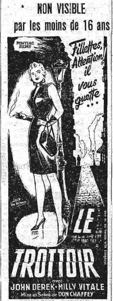Dans les années cinquante les journaux publiaient des vignettes en noir et blanc annonçant les films à l’affiche. Des œuvres éphémères comme par exemple Le Trottoir de 1957. On aura immédiatement compris de quoi il s’agit. Sous la plume et l’encre de Chine de Jack de Brown, plutôt connu comme dessinateur de comics, on découvre une dame assez élégante au sourire enjôleur, moulée dans une sorte de combinaison (cuir ?), la main gantée négligemment posée sur la hanche, fumant une cigarette au pied d’un réverbère, le tout en bas d’une ruelle pavée humide plongée dans la nuit tombante. Pour ce qui est des clichés, en veux-tu en voilà, comme dirait Luc Lagier. Remarquez aussi que la dame, toute respectueuse qu’elle soit, est comme exposée sur un plateau lumineux, façon vitrine de magasin de confection. On nous prévient dès le départ, le film est « non visible » par les moins de 16 ans, et surtout « Fillettes attention, il vous guette ». Qui ça donc ? Le trottoir bien sûr.
