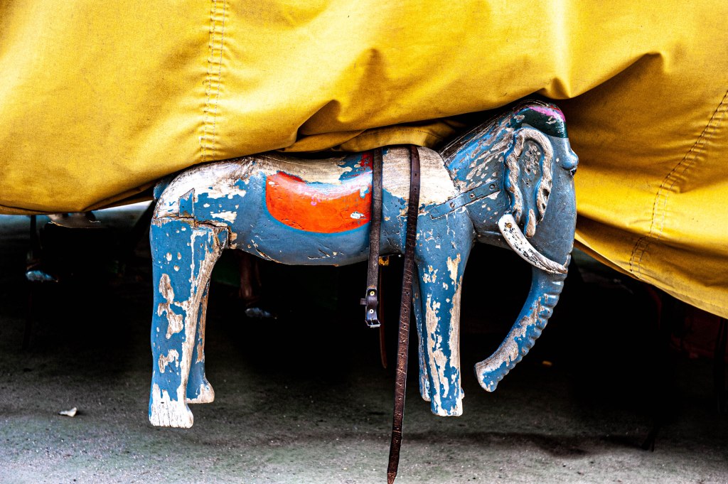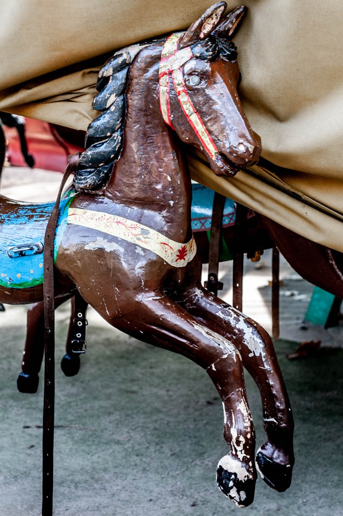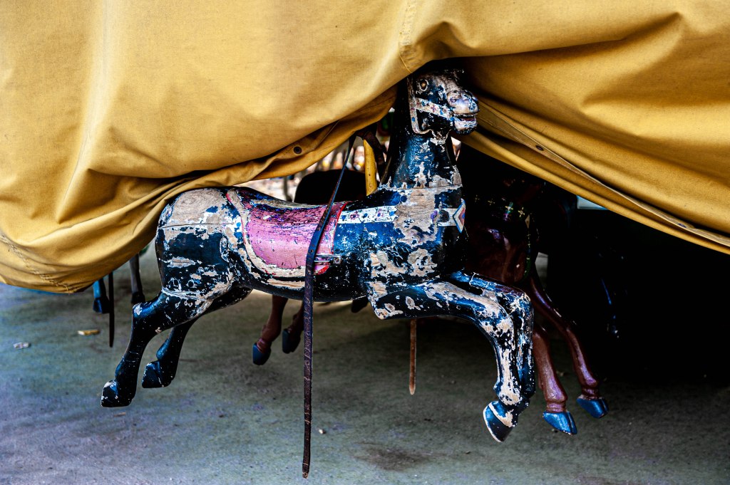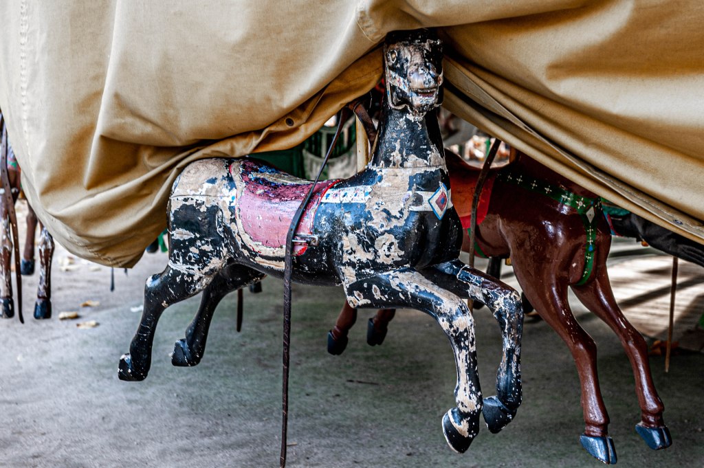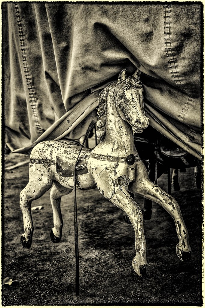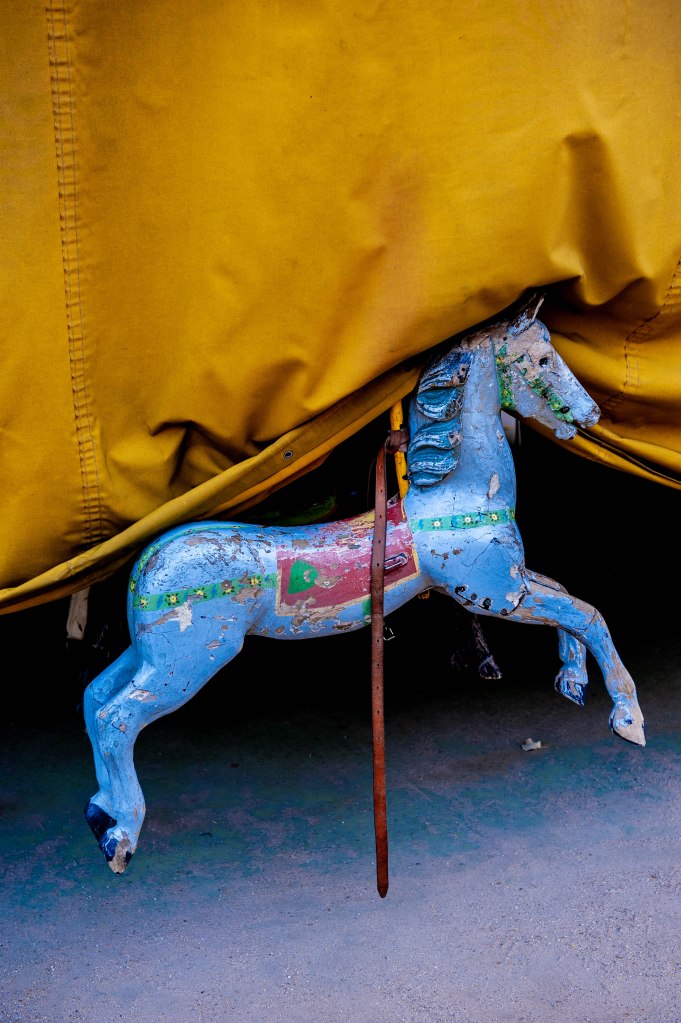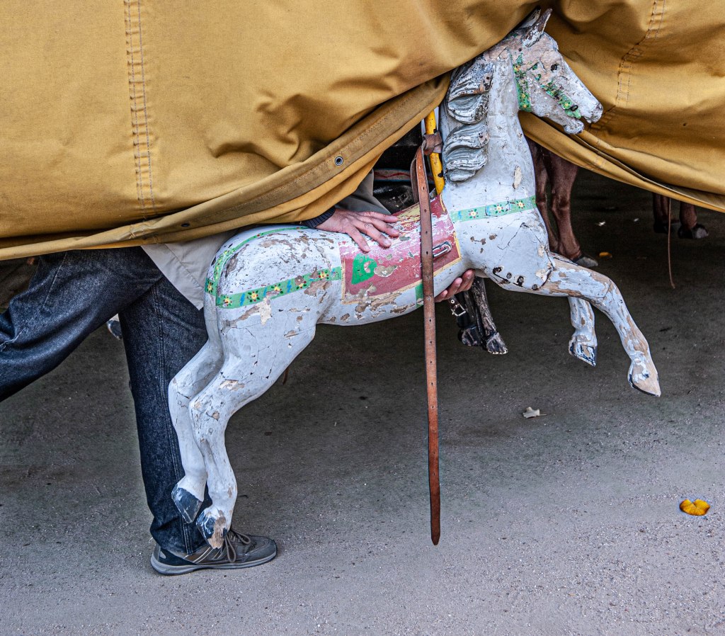 J’ai eu le plaisir de passer de bon matin devant le plus vieux manège de Paris qui tourne depuis plus d’un siècle au Jardin du Luxembourg. Il était encore fermé, et en m’asseyant sur une des chaises typiques du lieu je contemplais la lourde bâche qui protégeait nuitamment le carrousel. Puis soudain, comme par magie, le plateau se mis à tourner. Lentement un homme, le propriétaire du vénérable manège, avait mis un mystérieux mécanisme en route. Et c’est là que s’accomplit un mini miracle. Lentement la bâche levait un de ses coins et, tout aussi lentement, les chevaux se dévoilèrent les uns après les autres. Juste le temps de faire quelques images furtives, et tout le voile fut levé. Une autre magie, celle de la nostalgie, a pris place dans le jardin. Avec mon esprit un peu tordu parfois (ah bon, tu crois ?) je me suis demandé pourquoi, ici comme ailleurs, les chevaux tournent toujours dans le même sens, celui que les spécialistes appellent sinistrocentrique, bref à l’inverse des aiguilles d’une montre. C’est un vieux forain qui m’a glissé la réponse, « C’est pour que les gamins puissent faire plus facilement des signes à leurs parents de leur main droite ». A quand des manèges pour gauchers ?
