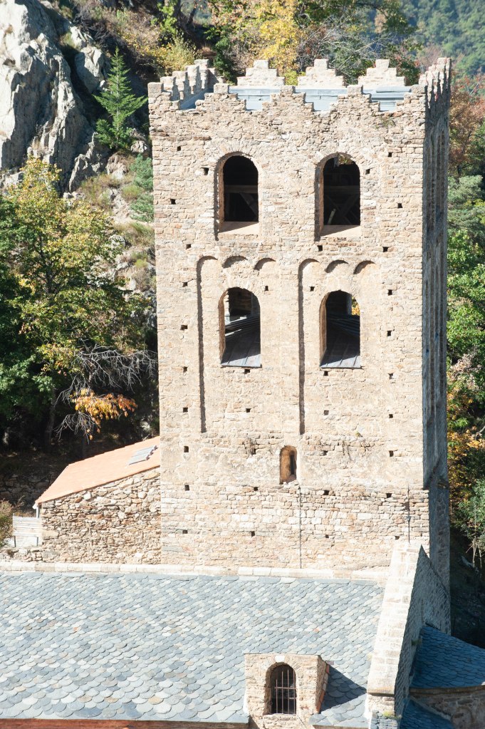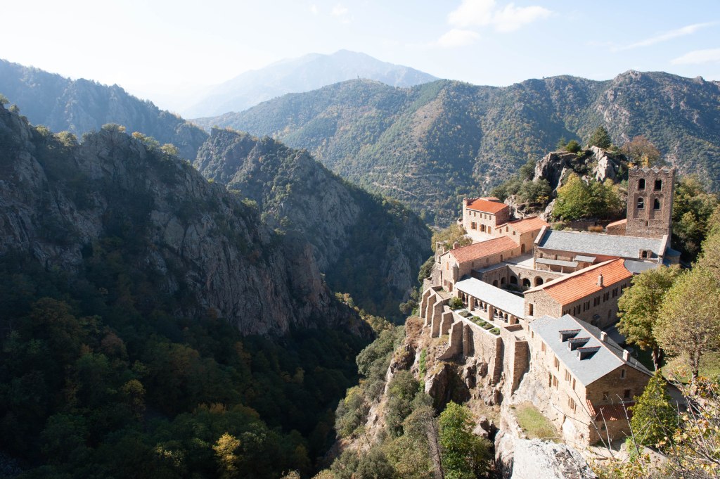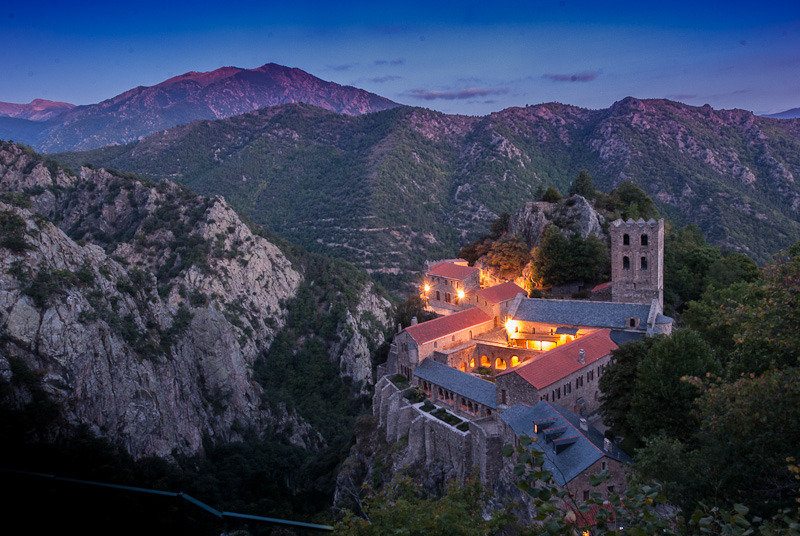 Même si vous n’êtes pas très versés dans la spiritualité, les bondieuseries et autres messes à la liturgie léthargique, je pense que l’abbaye de Saint Martin du Canigou dans les Pyrénées-Orientales a des choses à vous dire. Mais pour entamer la conversation, il va vous falloir mettre des chaussures de marche. Au départ de Casteil, Vernet-les-Bains, le sentier vous appelle. Il est ombragé, très praticable, vous y posez votre premier pas. Après c’est une marche sans grande difficulté, mais qui grimpe, dénivelé 250 m c’est pas non plus la mer à boire. Suivant votre habitude et vos capacités physiques, si il y a de la neige ou si vous êtes en plein midi, il vous faudra plus ou moins une heure pour accéder à l’abbaye. Alors là, planté sur son piton rocheux, ce chef d’œuvre de l’art romain va vous fait face. Maintenant vous vous dites qu’à l’époque, (on est au XIe siècle) construire ici dans la montagne quasi inaccessible, sans pelles mécaniques, grues ou hélico, il en fallait de la foi pour accomplir un tel ouvrage. Et dire que vous étiez presque à vous plaindre de cette marche entre le confort de votre voiture et la béatitude des lieux. Pauvres mécréants que nous sommes. Pour nous faire pardonner, allons visiter les lieux, nous serons guidés par un des membres de la communauté religieuse qui vit ici.