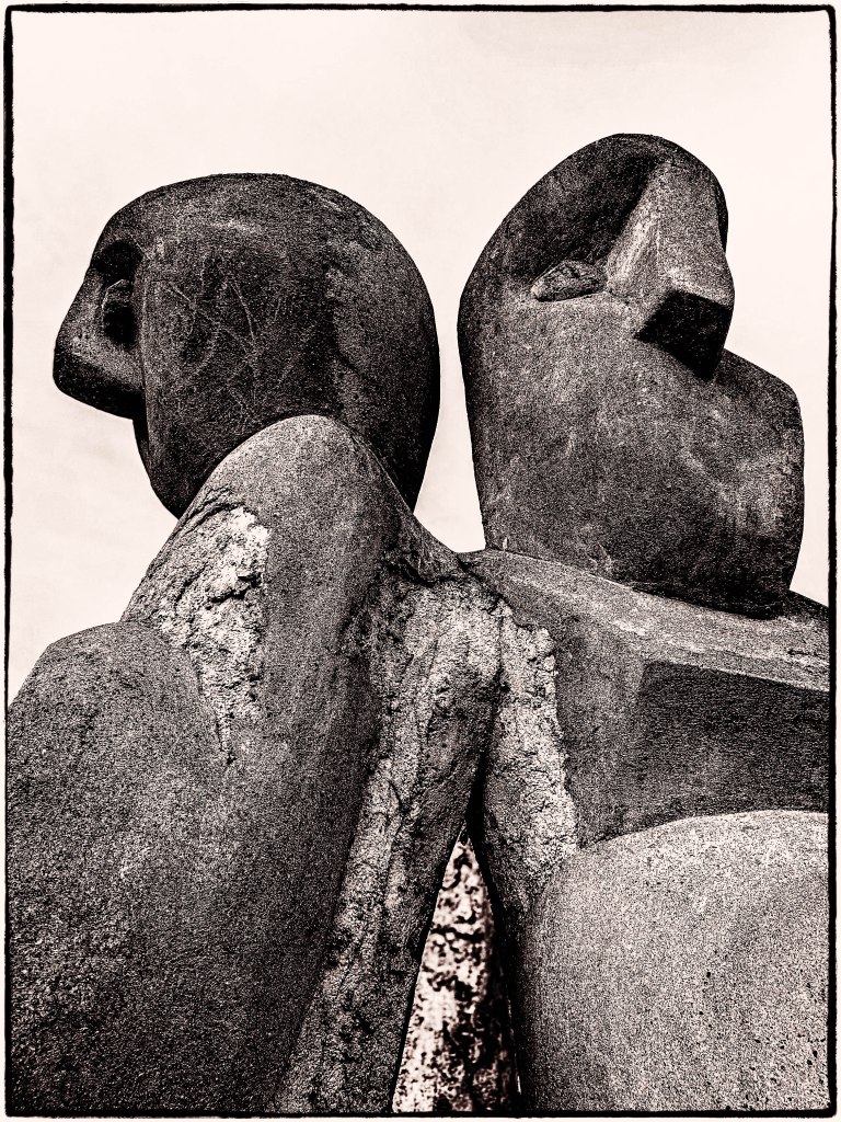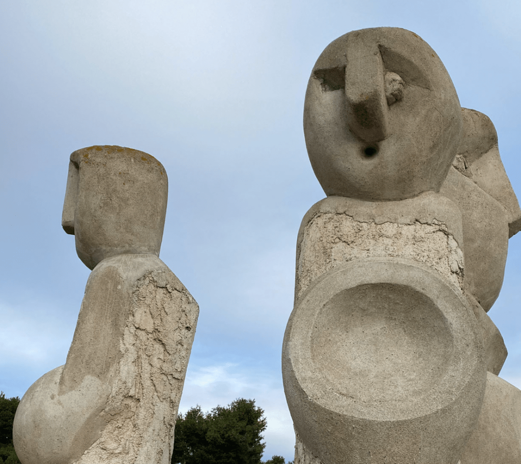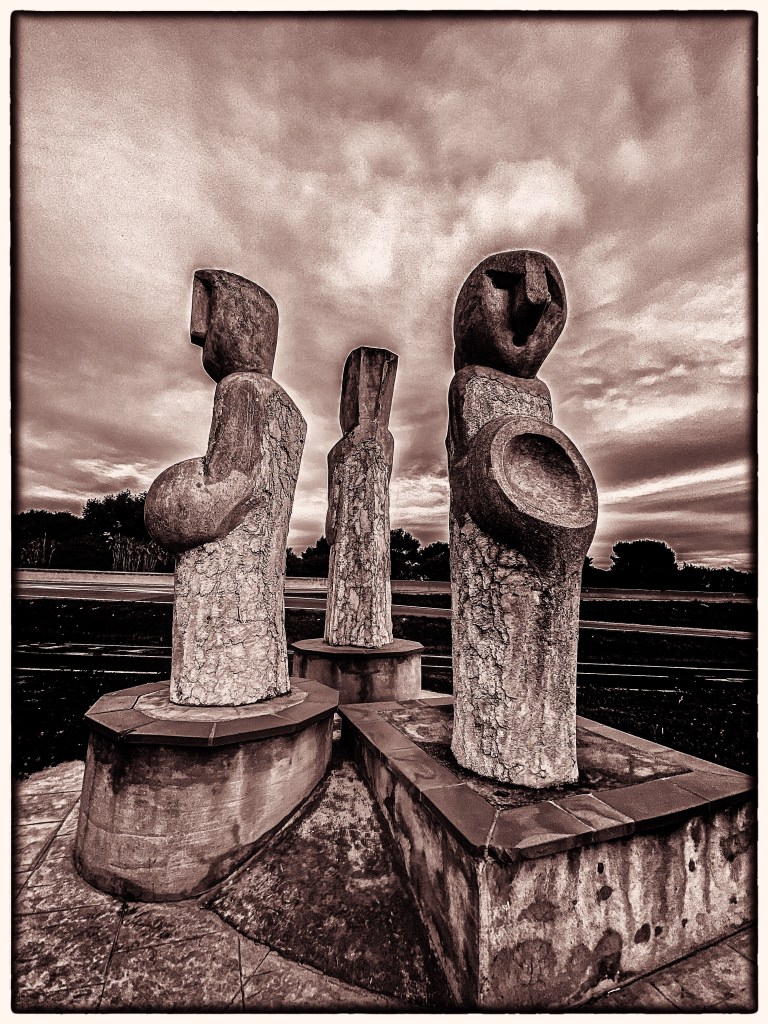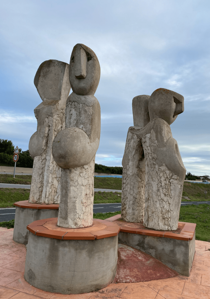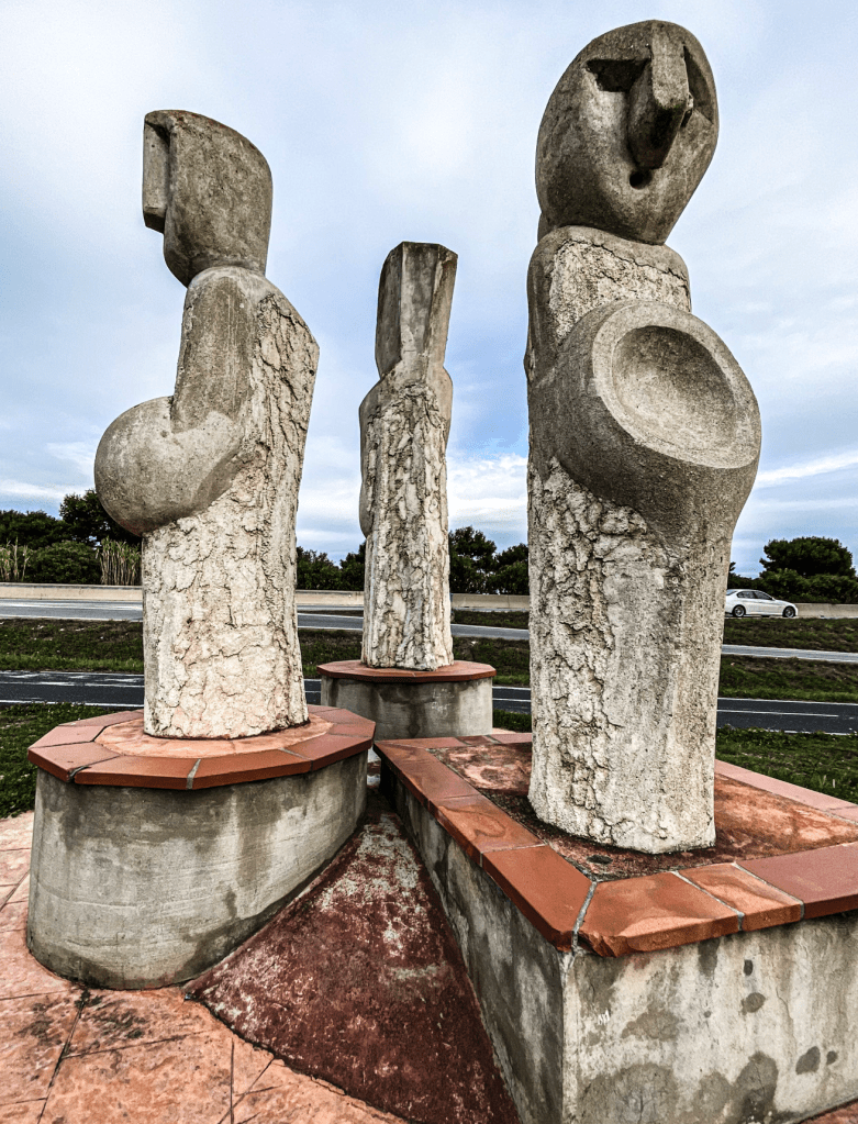 J’y suis passé devant des centaines de fois sans jamais trouver le temps de m’arrêter. Puis un jour ,quand même, j’ai fait un crochet, je suis sorti de ma trajectoire initiale pour aller voir de plus près cette étrange sculpture qui caracole à l’entrée de Canet-en-Roussillon. Cet ensemble à mi-chemin entre les gardiens de l’Île de Pâques (avec beaucoup d’imagination) et les sculptures type art premier, c’est La Rose des vents. Ces quatre humanoïdes sont signés de l’artiste contemporaine Pascale Voirin dont l’œuvre a été présentée in situ en 1991 lors du premier symposium organisé par la ville. Les quatre susnommés fixent les quatre points cardinaux, et se font chatouiller par la tramontane les jours où elle passe, d’où le titre. Il s’agit surtout là d’une création inspirée des techniques du brutalisme, travail du ciment, du béton, du sable des armatures métalliques. Et puis le temps, les intempéries, font le reste et procurent à l’ensemble une patine craquelée autant de rides qui se creusent et qui nous rappellent que rien ni personne n’est éternel. Et c’est tant mieux.
